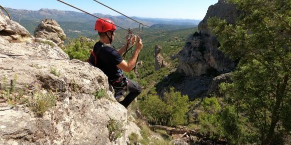 Bajando el sendero de inicio llegamos a donde empieza el cable donde tendremos una vista del valle de Tus y de los Calares del Rio Mundo. Aquí empezamos bordeando la roca para que la sensación de altura haga presencia y comenzamos a descender y ascender varios tramos con vistas impresionantes sin mucha complicación, llegamos al tramo final del K2 sin antes pasar por un cortito puente de tramex sobre una grieta para poner a prueba nuestro equilibrio.